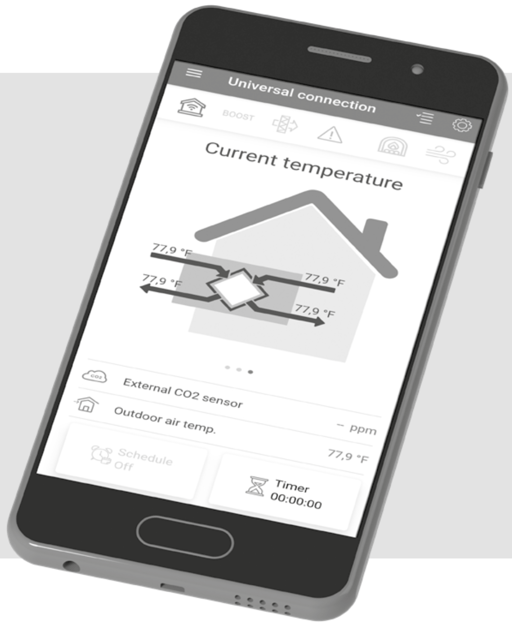 Les unités KVUT/KVUE VB A21 sont équipées d'un système d'automatisation intégré. Le contrôleur A21 permet d'intégrer l'unité dans le système Smart Home ou BMS (Building Management Systems). Le panneau de commande à distance n'est pas inclus dans le kit de livraison (disponible séparément). Application mobile à télécharger pour contrôler l'unité via Wi-Fi.